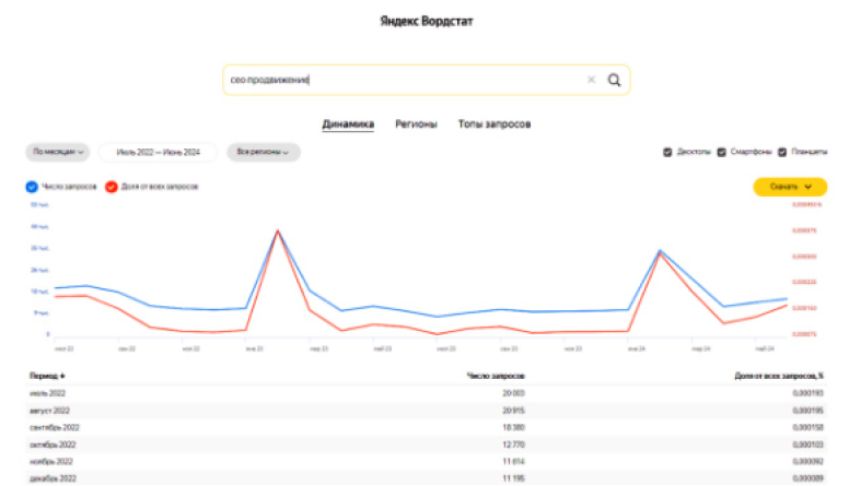 Здесь используются инструменты Яндекс.Вордстат, Google Keyword Planner и KeySO. Другие ресурсы – Ahrefs и SEMrush – для России отныне не работают.